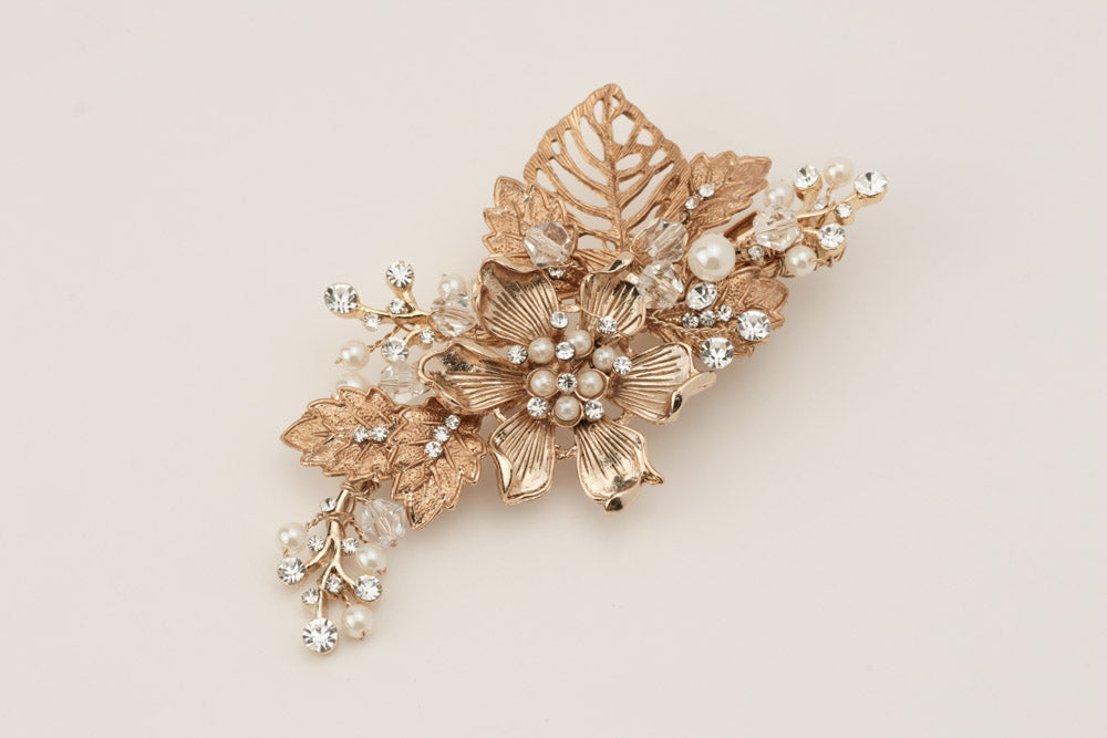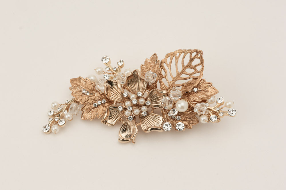 Add a touch of vintage glamour to your hair with this charming alligator clip. Designed in antique gold and adorned with pearls and Swarovski crystals, it's a small yet radiant accessory that elevates your style effortlessly.