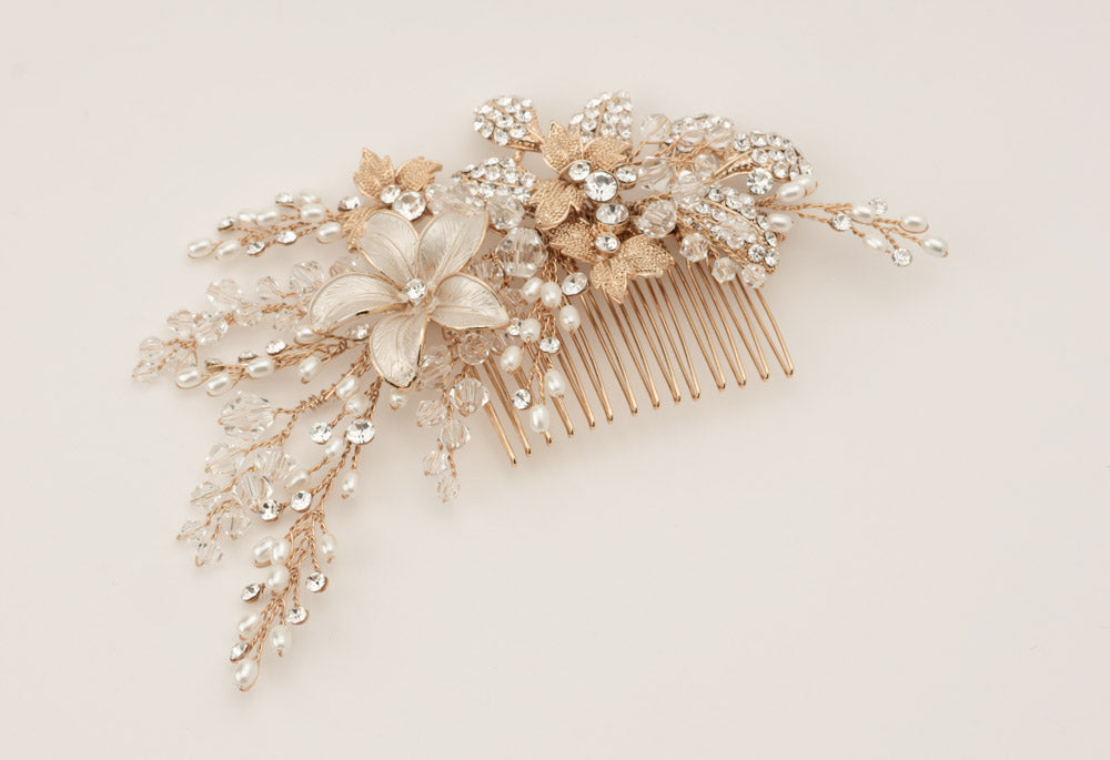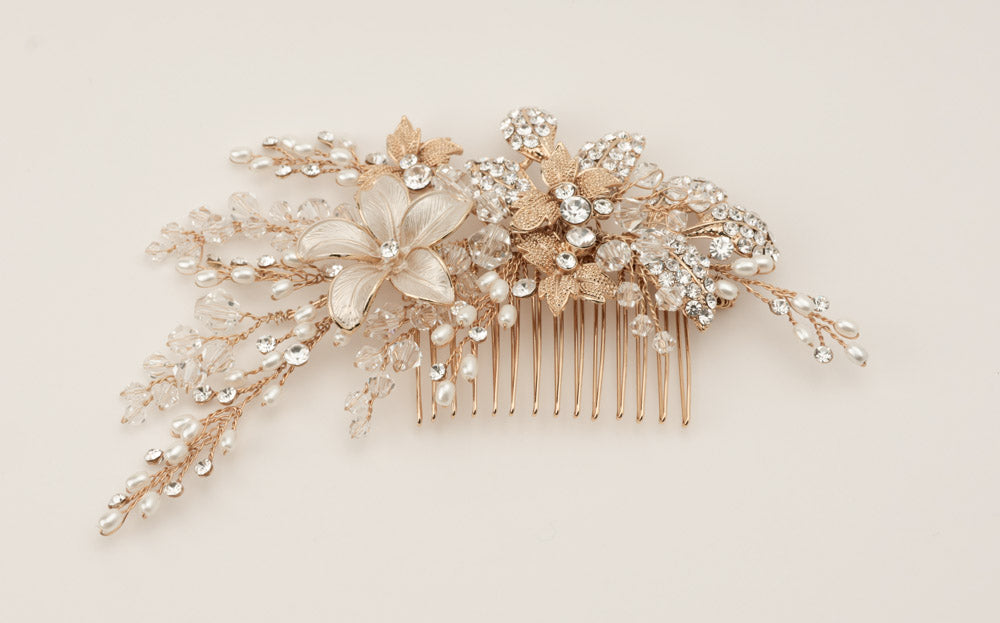 Unveil the allure of timeless beauty with this stunning floral hair comb, adorned with Swarovski crystals and freshwater pearls in antique gold. It's a timeless piece that adds a touch of elegance to any look.