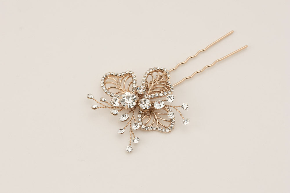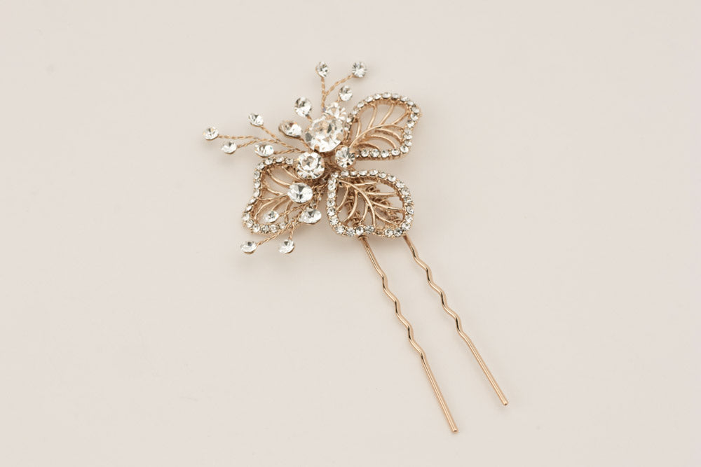 The Vivienne, a meticulous creation designed to add a touch of timeless elegance to your hairstyle. The pin can be worn on its own or in groups, perfect for a chignon. Each pin is lovingly handcrafted, to ensure exquisite floral detailing and shimmering crystal accents that catch the light beautifully.